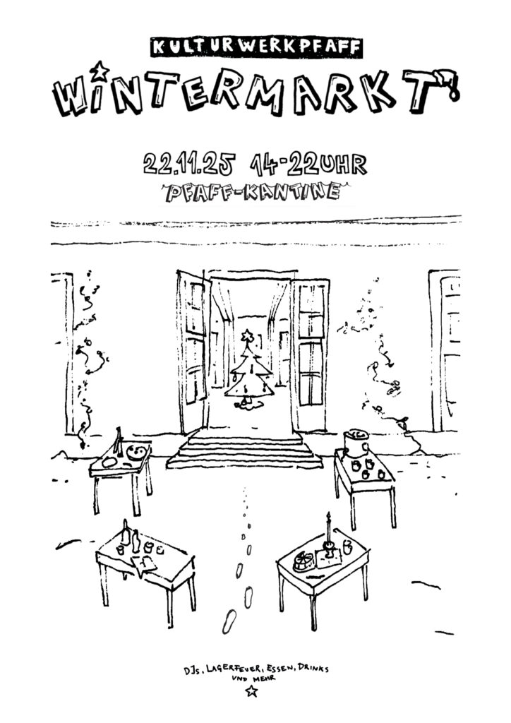 Mit dem Wintermarkt endete unser Zwischenmietrecht für die alte Pfaff-Kantine. Aber ihr seid nochmal alle gekommen. Bei Minusgraden und Sonnenschein. Es war super. Vielen Dank! Wir hoffen sehr, dass es in 2026 weitergehen wird. Wir halten euch auf dem Laufenden. Unterstützt uns gerne, werdet Mitglied, bis hoffentlich bald!